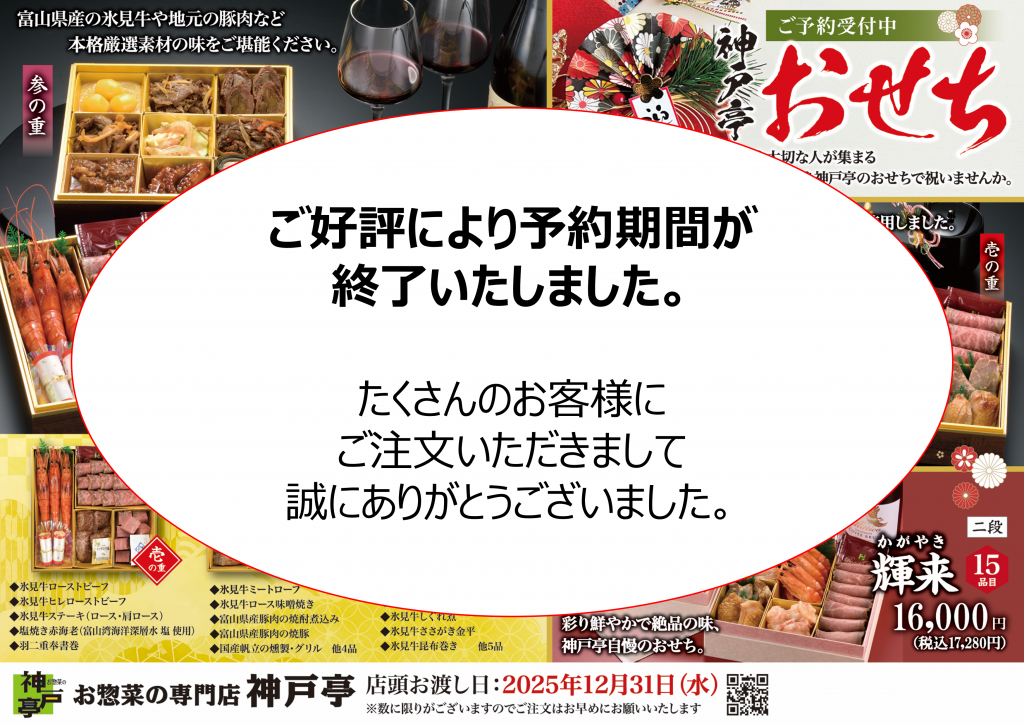 「神戸亭おせち」予約受付終了のお知らせ
